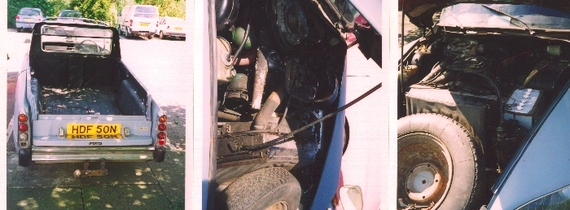 Daisy used to be a Safari until she had a run in with an overzealous local authority team collecting abandoned cars. Lifting her bt crane they damaged her roof and that gave us the idea to chop her down into a pick-up truck for use on the farm in Crete Sadly Daisy succumbed to the old evil - RUST. A couple of very unpleasant patches of the rot broke through on her chassis where they proved to be untreatable. Save for a total chassis replacement her fate was sealed. For a while it looked as though she would go to a private motor museum but when negotiations broke down we decided to strip her for spares. If you need any parts for a Safari or break then let us know. We expect to start selling the parts openly on eBay sometime in spring 2008.